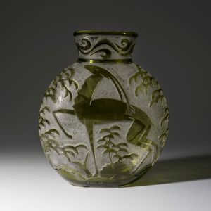 This art deco vase was made by French glass manufacturer Daum in about 1925. Cameo glass and an acid-etch techniques were used to create the stylised scene of a male and a female deer surrounded by foliage, with narrow bands and a scroll pattern encircling the neck above.